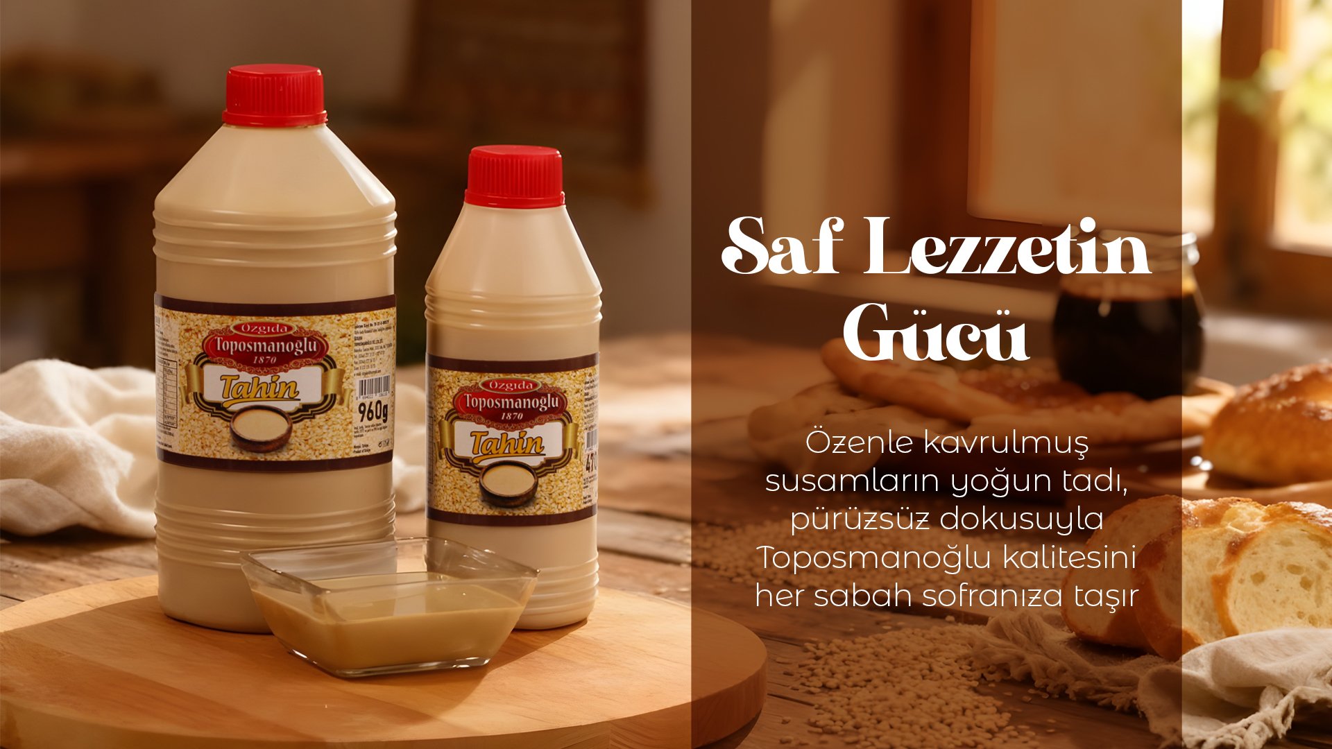 Neden tas degirmen? Dusuk devir, bugday rengi kivam ve susam aromasi korunur. OZGIDA Toposmanoglu tahin, yag ayrismasin...
